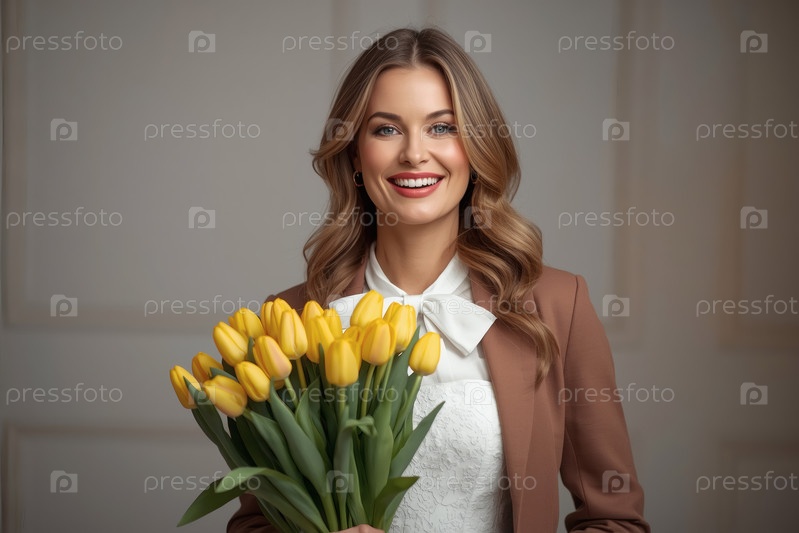 Концепция праздника, посвященного Международному женскому дню 8 марта.Молодая женщина в элегантном платье с луком держит букет желтых тюльпанов в ярком интерьере