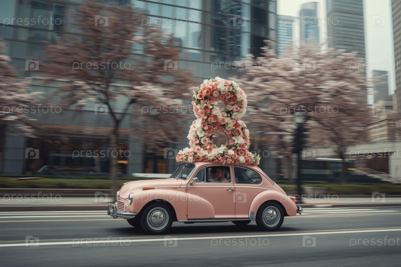 Концепция праздника Международного женского дня 8 марта.Розовый ретро-автомобиль с цветной аранжировкой в форме восьмерки на крыше, движущийся по улице города среди небоскребов