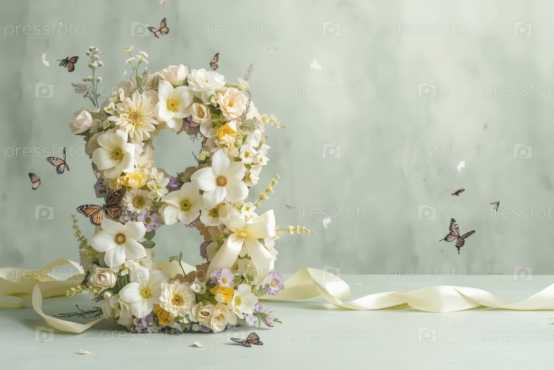 Международный женский день. баннер, флаер, красивая открытка на 8 марта. цветы в форме цифры восемь и бабочки на простом фоне