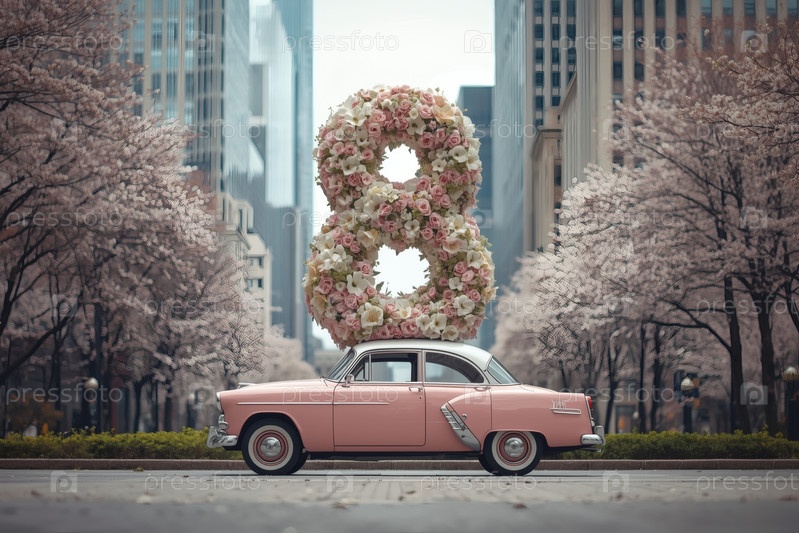 Концепция праздника Международного женского дня 8 марта.Розовый ретро-автомобиль с цветной аранжировкой в форме восьмерки на крыше, движущийся по улице города среди небоскребов