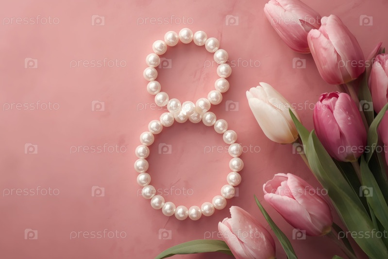 Международный женский день. баннер, флаер, красивая открытка 8 марта. жемчужины в форме цифры восемь и тюльпаны на розовом фоне