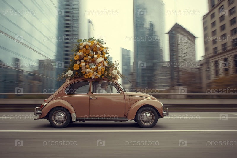 Концепция праздника, посвященного Международному женскому дню 8 марта. бежевый ретро-автомобиль с цветной аранжировкой в форме восьмерки на крыше, движущийся по улице города, окруженной небоскребами