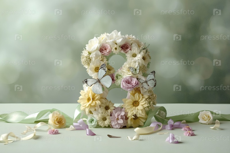 Международный женский день. баннер, флаер, красивая открытка на 8 марта. цветы в форме цифры восемь и бабочки на простом фоне