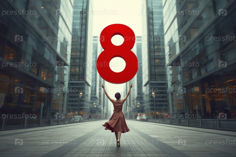 Концепция праздника, посвященного Международному женскому дню 8 марта.Женщина держит огромный шар в форме восьмерки на городской улице, окруженной небоскребами
