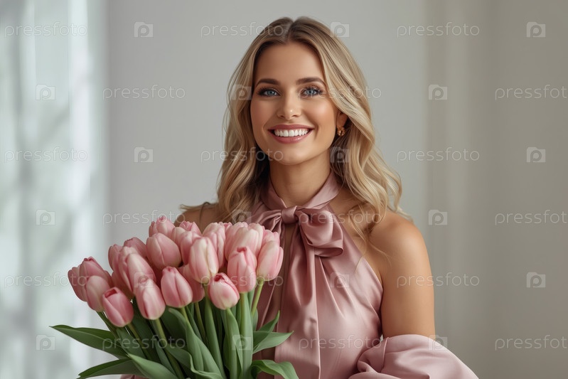 Концепция праздника, посвященного Международному женскому дню 8 марта.Молодая женщина в розовом элегантном платье с луком держит букет белых и розовых тюльпанов в ярком интерьере