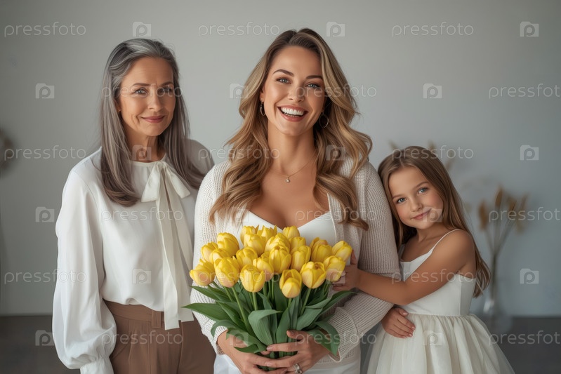 Концепция праздника, посвященного Международному женскому дню 8 марта.Три поколения женщин.Молодая женщина, несущая букет тюльпанов, в сопровождении пожилой матери и маленькой дочери