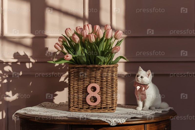 Концепция празднования Международного женского дня 8 марта. букет розовых тюльпанов в плетеновой корзине и белый котенок на столе у окна