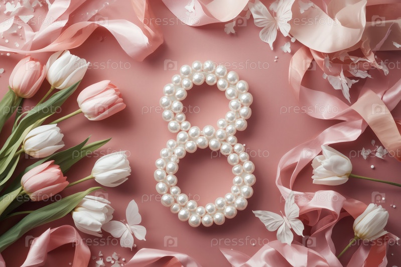 Международный женский день. баннер, флаер, красивая открытка 8 марта. жемчужины в форме цифры восемь и тюльпаны на розовом фоне
