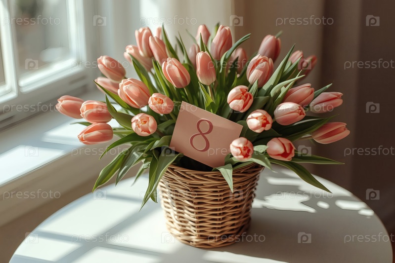 Концепция празднования Международного женского дня 8 марта. букет розовых тюльпанов в плетеновой корзине с номером 8 на столе у окна