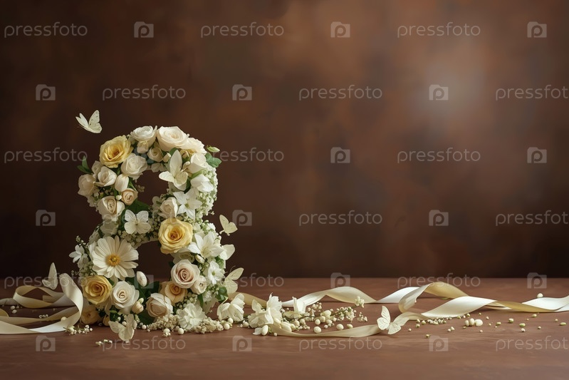 Международный женский день. баннер, флаер, красивая открытка на 8 марта. цветы в форме цифры восемь и бабочки на простом фоне