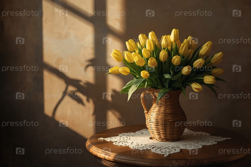 Концепция празднования Международного женского дня 8 марта: букет желтых тюльпанов в плетеновой корзине на столе у окна