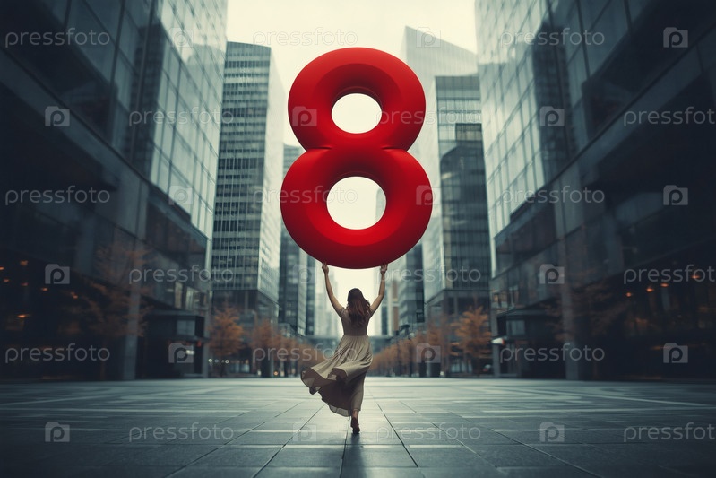 Концепция праздника, посвященного Международному женскому дню 8 марта.Женщина держит огромный шар в форме восьмерки на городской улице, окруженной небоскребами