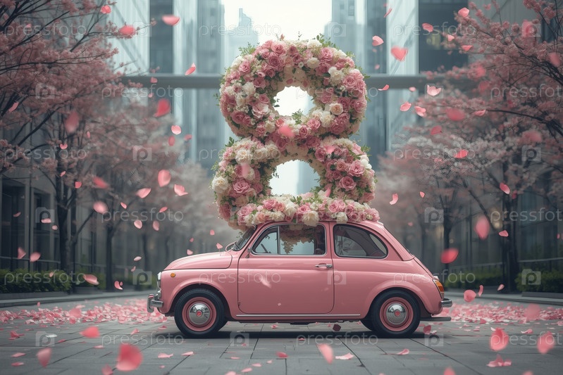 Концепция праздника Международного женского дня 8 марта.Розовый ретро-автомобиль с цветной аранжировкой в форме восьмерки на крыше, движущийся по улице города среди небоскребов