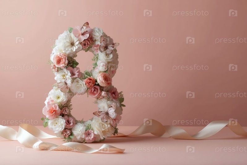 Международный женский день. баннер, флаер, красивая открытка на 8 марта. цветы в форме цифры восемь и бабочки на простом фоне