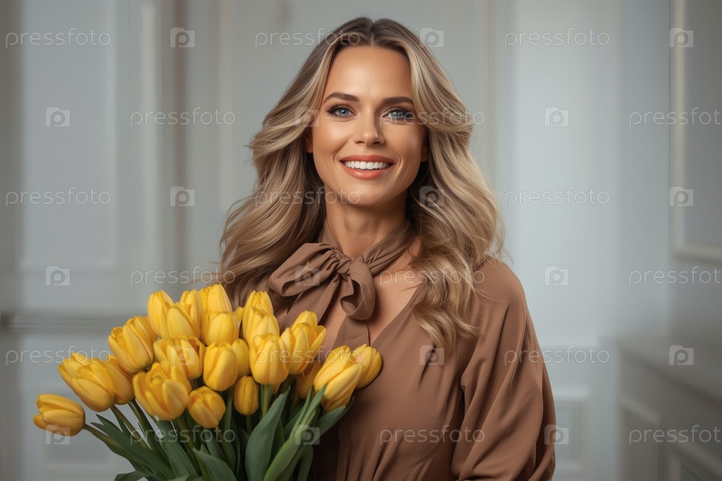 Концепция праздника, посвященного Международному женскому дню 8 марта.Молодая женщина в элегантном платье с луком держит букет желтых тюльпанов в ярком интерьере