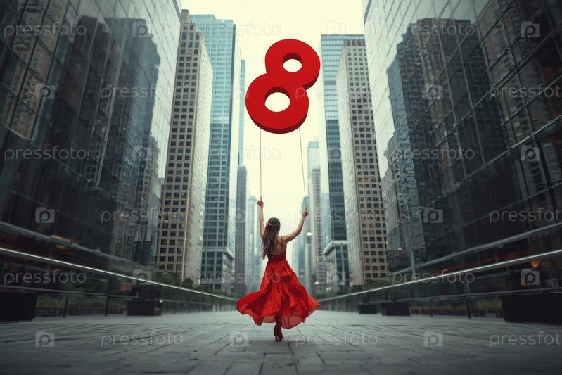 Концепция праздника, посвященного Международному женскому дню 8 марта.Женщина держит огромный шар в форме восьмерки на городской улице, окруженной небоскребами