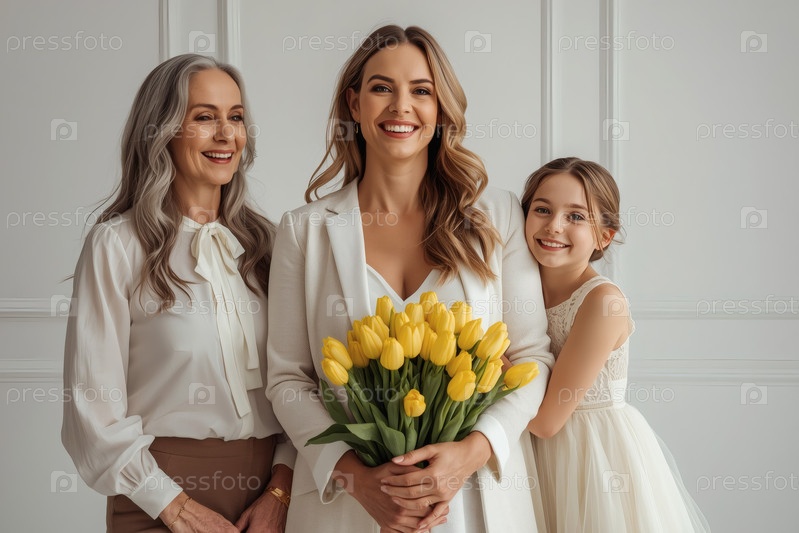 Концепция праздника, посвященного Международному женскому дню 8 марта.Три поколения женщин.Молодая женщина, несущая букет тюльпанов, в сопровождении пожилой матери и маленькой дочери