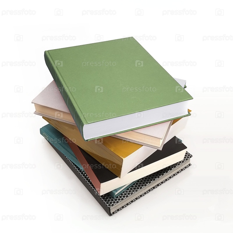 Куча книг в цветных обложках с белыми листами, изолированными на белом фоне
