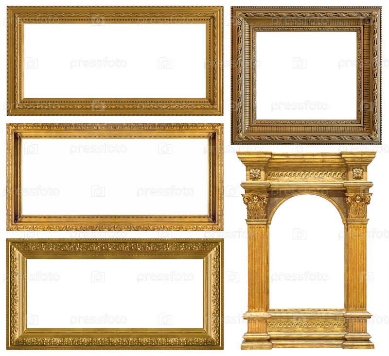 Набор золотых рамок для картин, зеркал или фотографий, изолированных на белом фоне