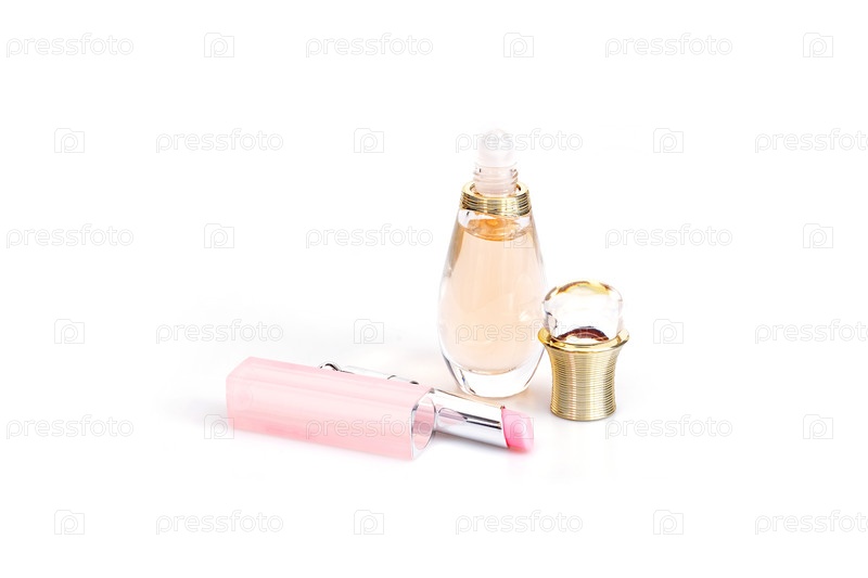 Дизайн парфюмерной бутылки изолированный и розовая помада на белом фоне