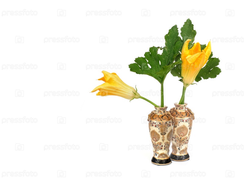 Желтый тыквенный цветок в традиционной китайской вазе изолирован на белом фоне, отрезка готова
