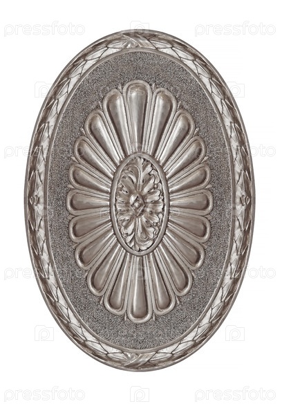 Серебряный декоративный элемент в виде цветка или щита, изолированного на белом фоне