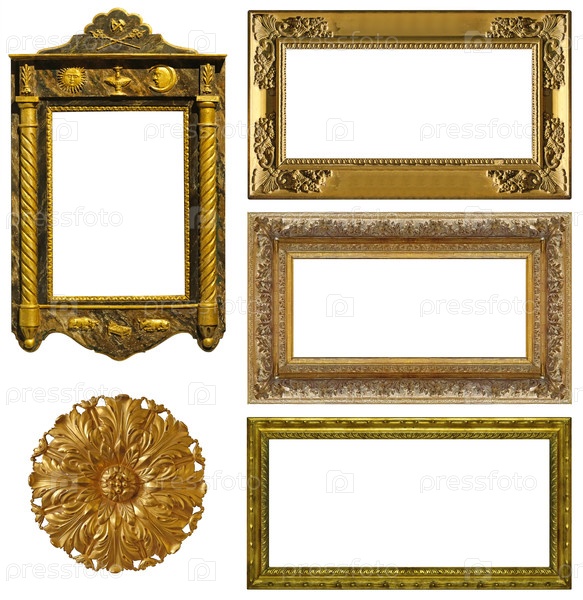 Набор золотых рамок для картин, зеркал или фотографий, изолированных на белом фоне