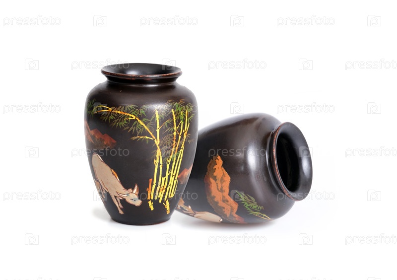 Вьетнамская черная лаковая ваза с ручной живописью, изолированной на белом фоне