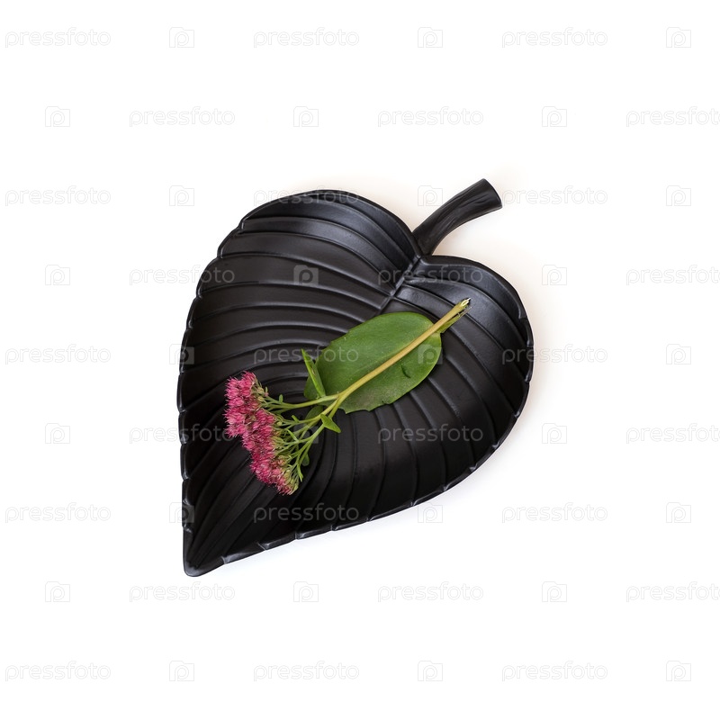 Композиция с розовым цветом на черной тарелке, изолированная на белом фоне