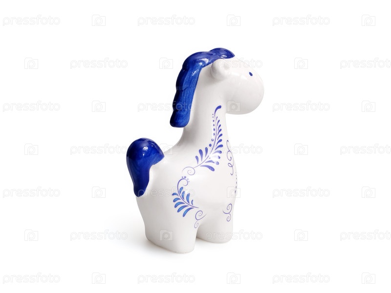Традиционная керамическая конская статуэтка с белой глазурью и синими декоративными мотивами, изолированной на белом фоне, готовая к вырезке