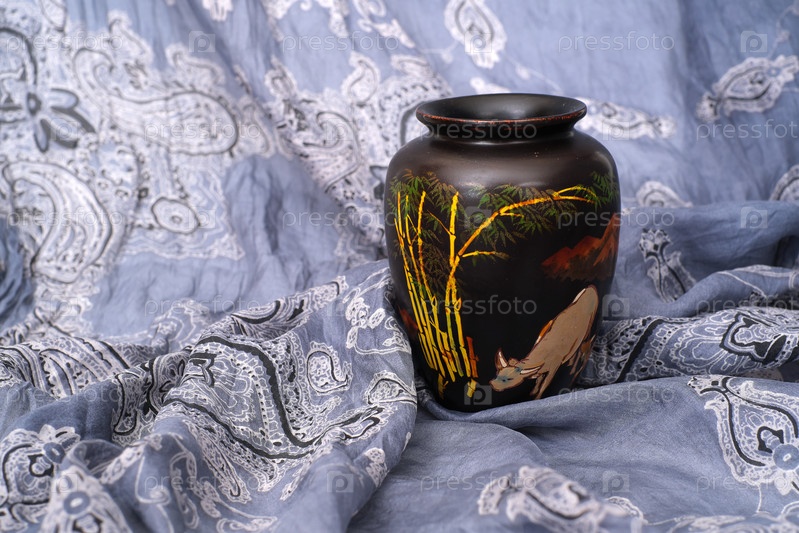Вьетнамская черная лаковая ваза с ручной живописью изолирована на синей шелковой ткани
