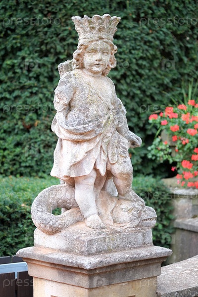 Классическая скульптура Путто в парке Бухловицкого дворца (Чешская Республика).Статуя бароккового сада Америка, летний вейв