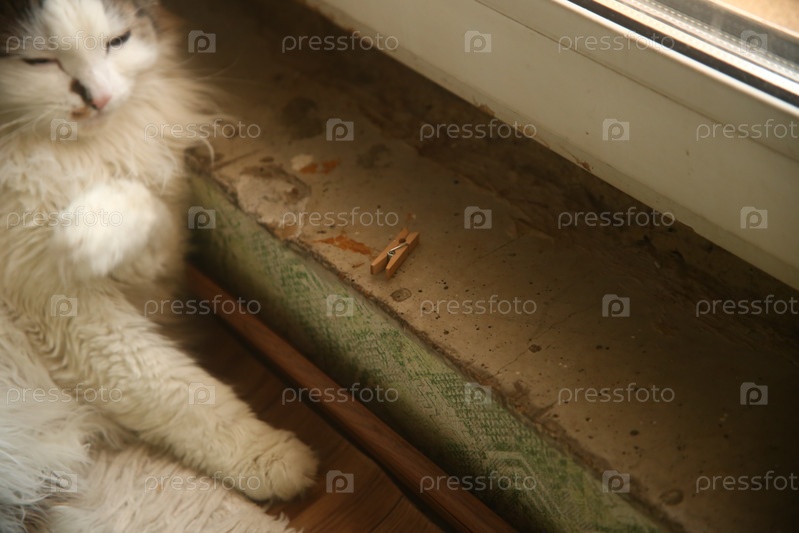 Милый черно-белый спящий кот смотрит на прищепку на полу