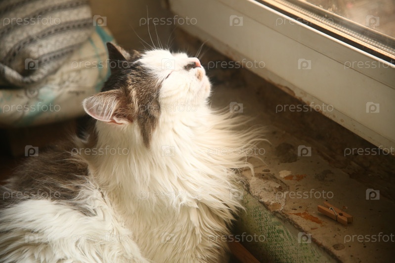 Милый черно-белый кот смотрит на солнце в окно