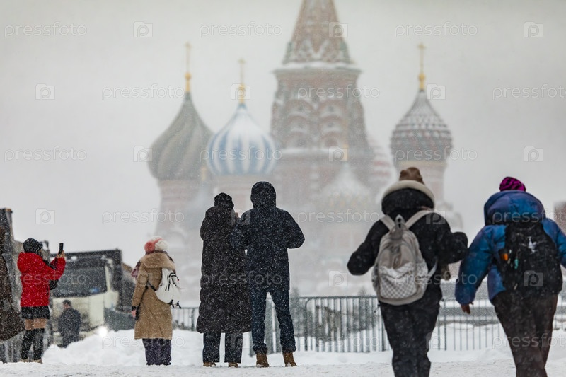 Люди на фоне собора Василия Блаженного на Красной площади зимой