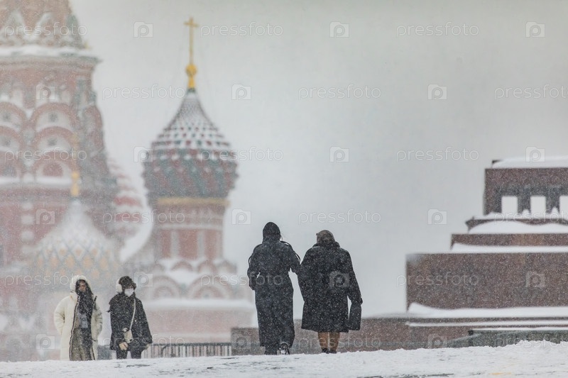 Люди на фоне собора Василия Блаженного на Красной площади зимой