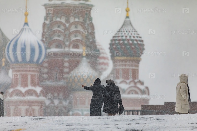 Люди на фоне собора Василия Блаженного на Красной площади зимой