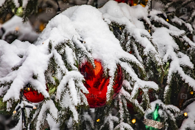 Заснеженные ветки ели с новогодними шарами и гирляндой