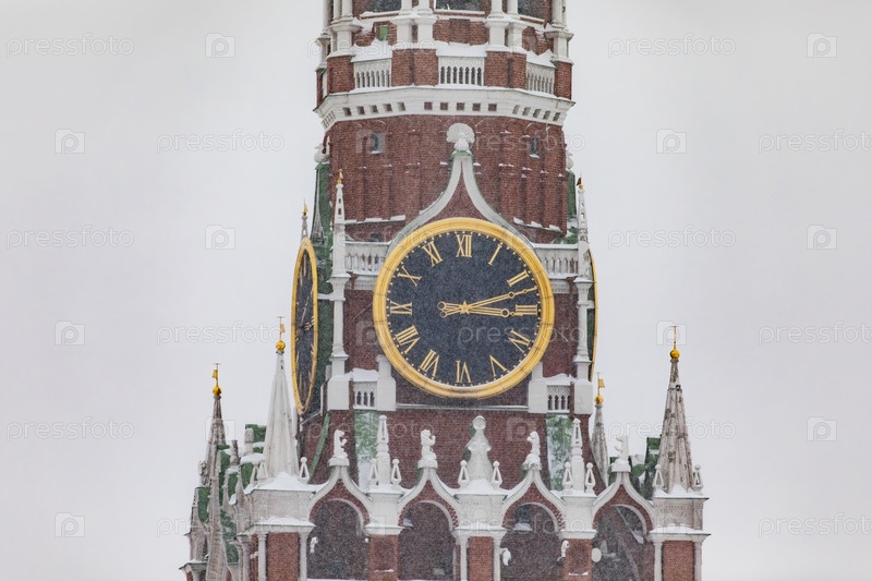 Спасская башня Московского Кремля с курантами зимой
