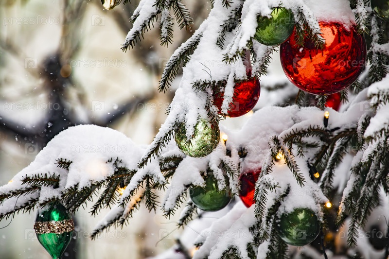 Заснеженные ветки ели с новогодними шарами и гирляндой