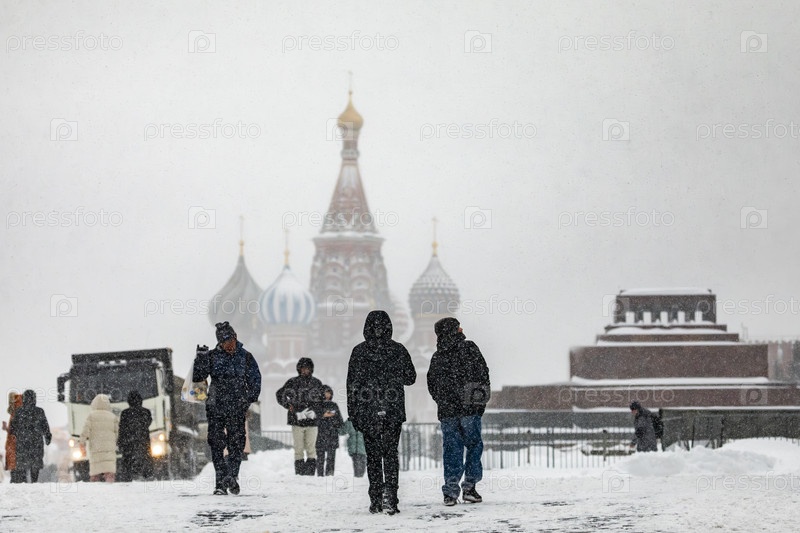 Люди на фоне собора Василия Блаженного на Красной площади зимой