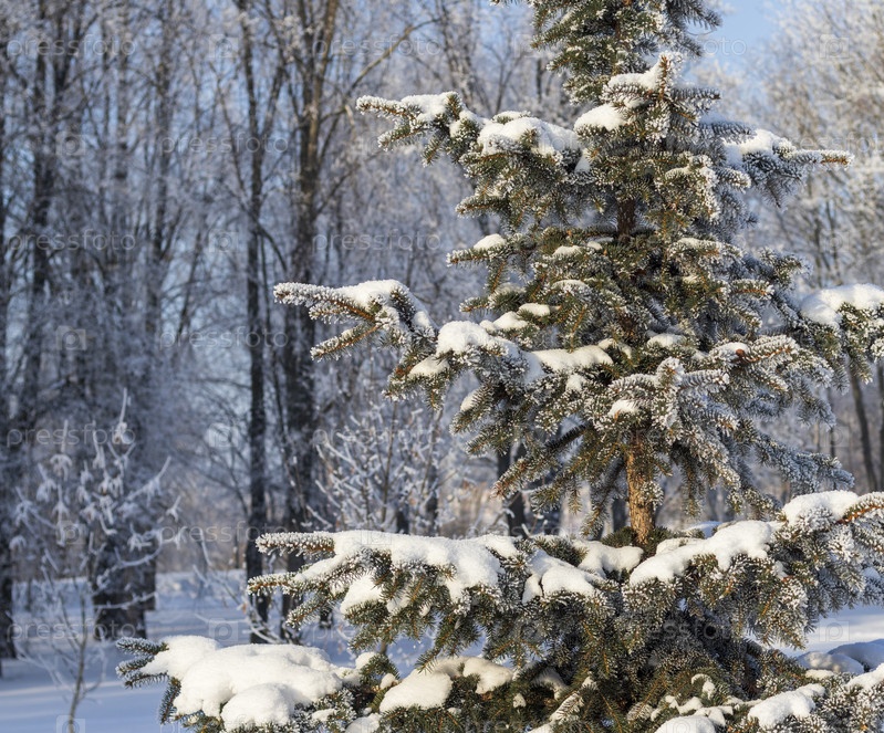 Зимняя сцена с вечнозелеными деревьями, саженцами, покрытыми снегом