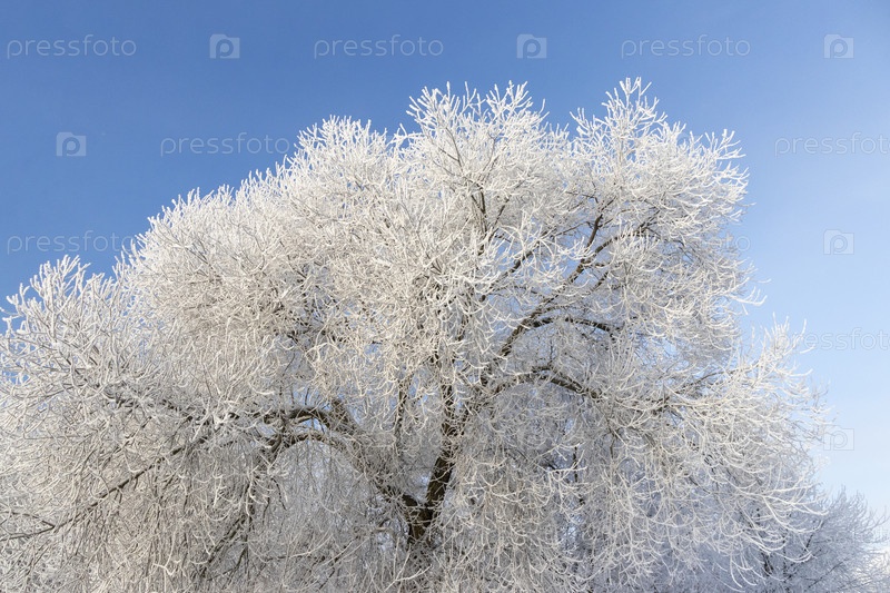 Зимняя сцена с деревьями, покрытыми морозом под чистым голубым небом