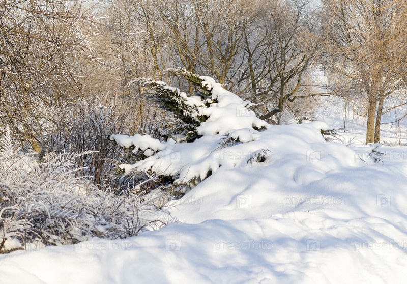 Зимняя сцена с вечнозелеными деревьями, саженцами, покрытыми снегом