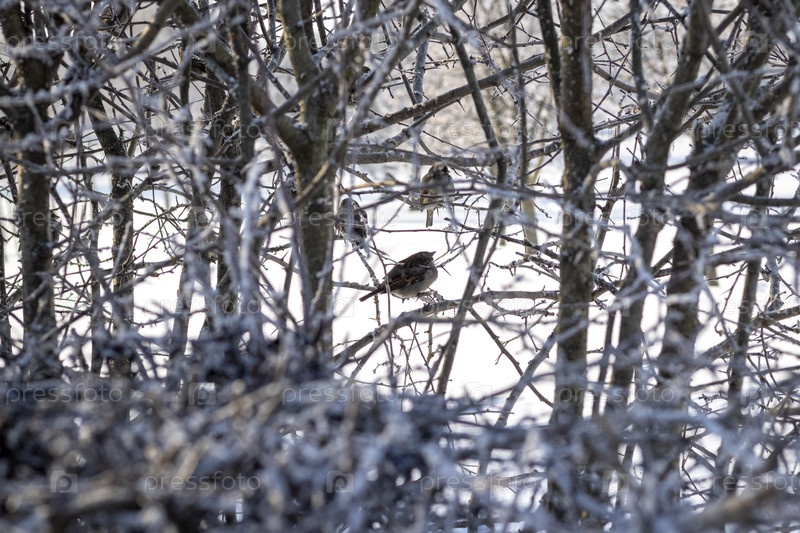 Воробей на кусте, покрытом морозом