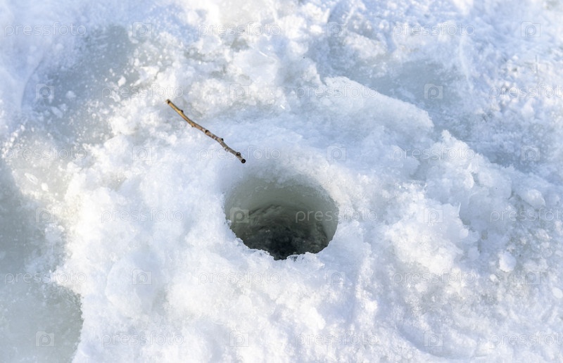 На изображении показано отверстие, вырезанное в замерзшее озеро, обычно используемое для рыбалки на льду