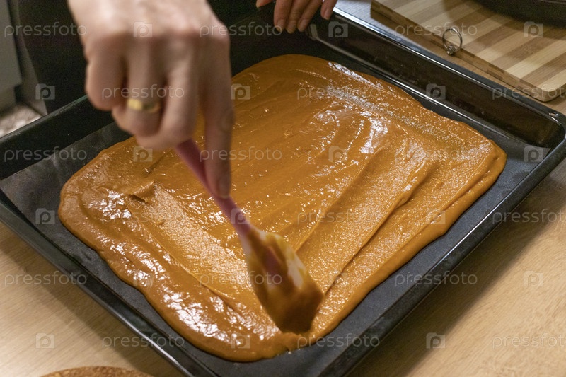 Человек разносит коричневый, тяжелый сладкий сливочный крем на тарелке для выпечки