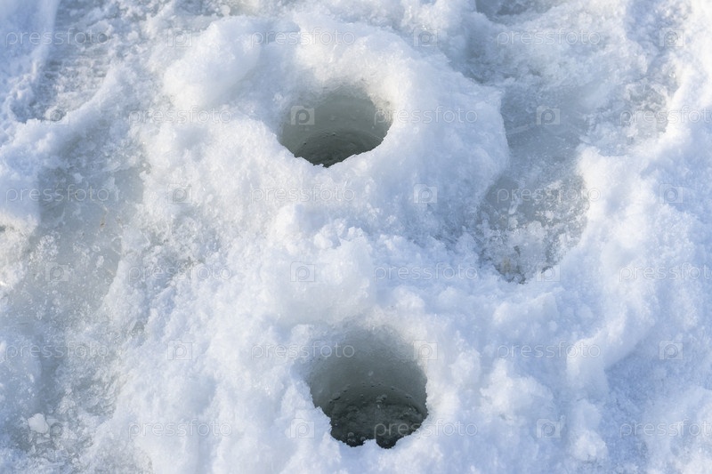На изображении показано отверстие, вырезанное в замерзшее озеро, обычно используемое для рыбалки на льду