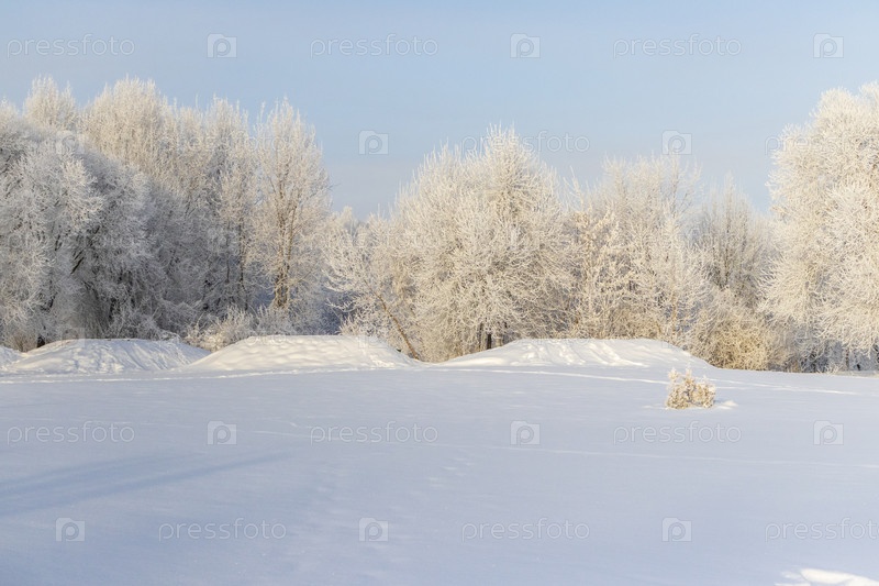 Зимняя сцена с деревьями, покрытыми морозом под чистым голубым небом