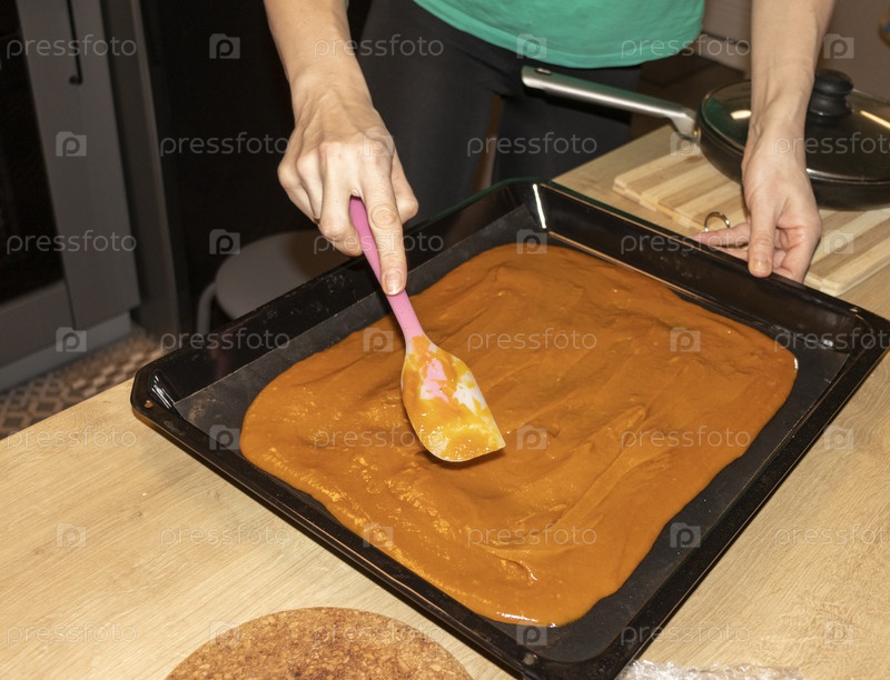Человек разносит коричневый, тяжелый сладкий сливочный крем на тарелке для выпечки